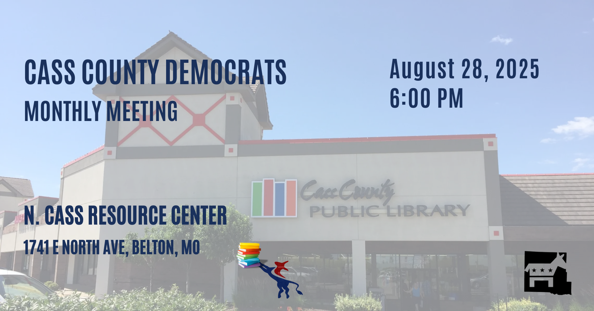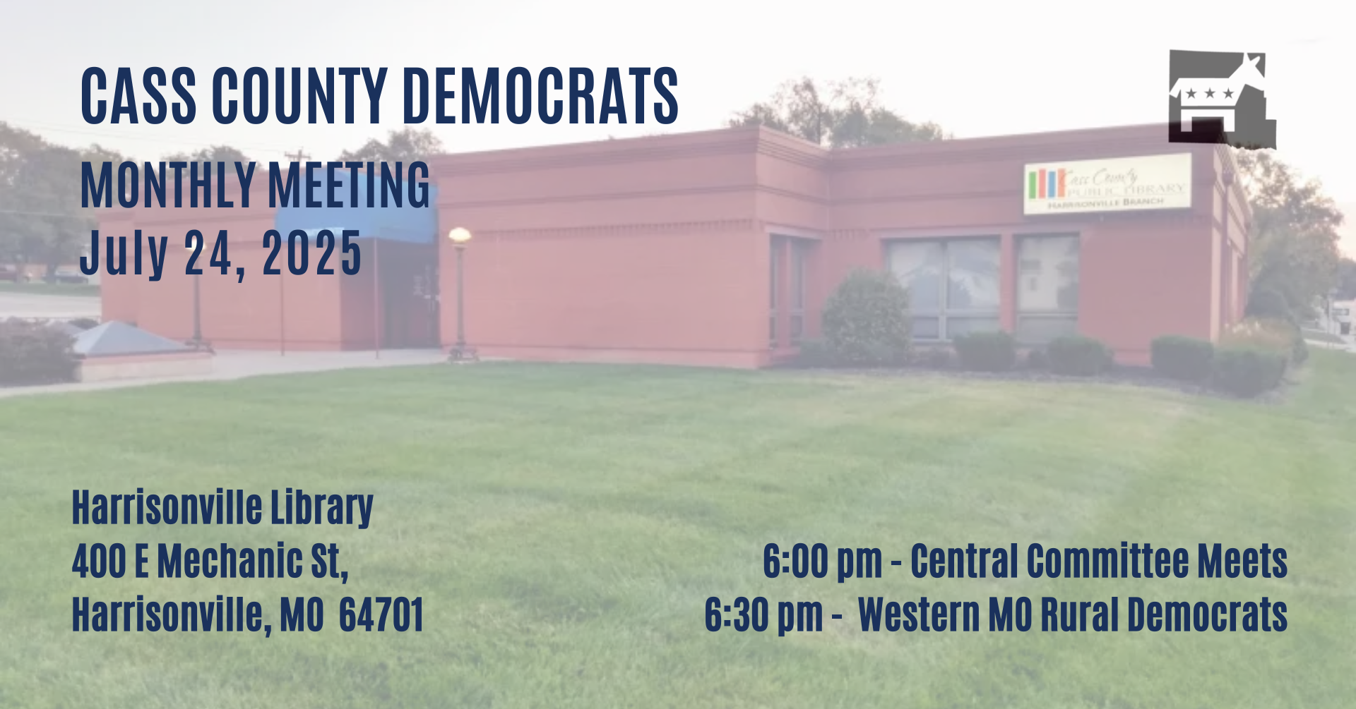 URGENT UPDATE - Due to the storms in North Cass tonight, the Central Committee will NOT be meeting. The Western MO Rural Democrats will still be meeting at 6:00pm at the Harrisonville Library. Please join them if you'd like, and be safe.