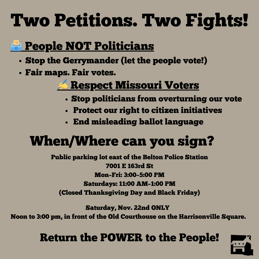 There will be an opportunity to sign both the Respect MO Voters and People NOT Politicians petitions in Raymore on Saturday, October 25th.