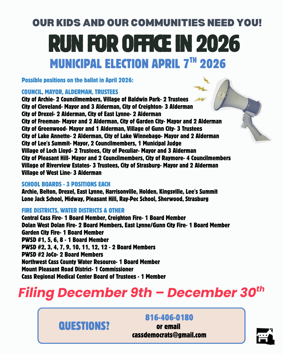 Candidate recruitment for April & November 2026, over 100 offices on the ballot! Where do YOU want to jump into the fight?
